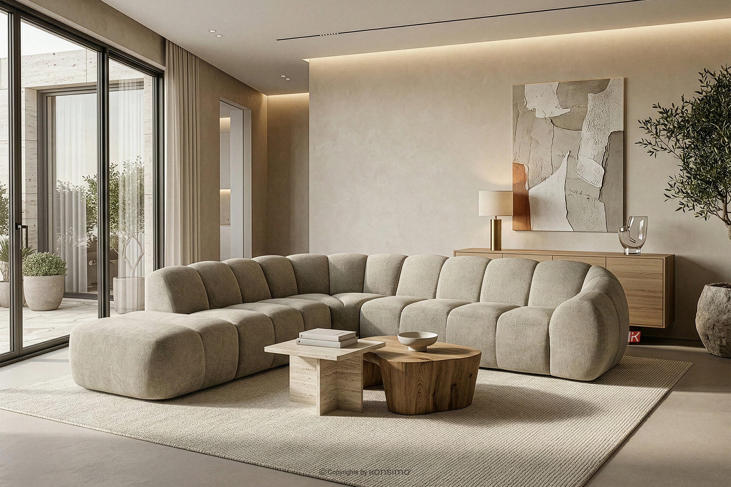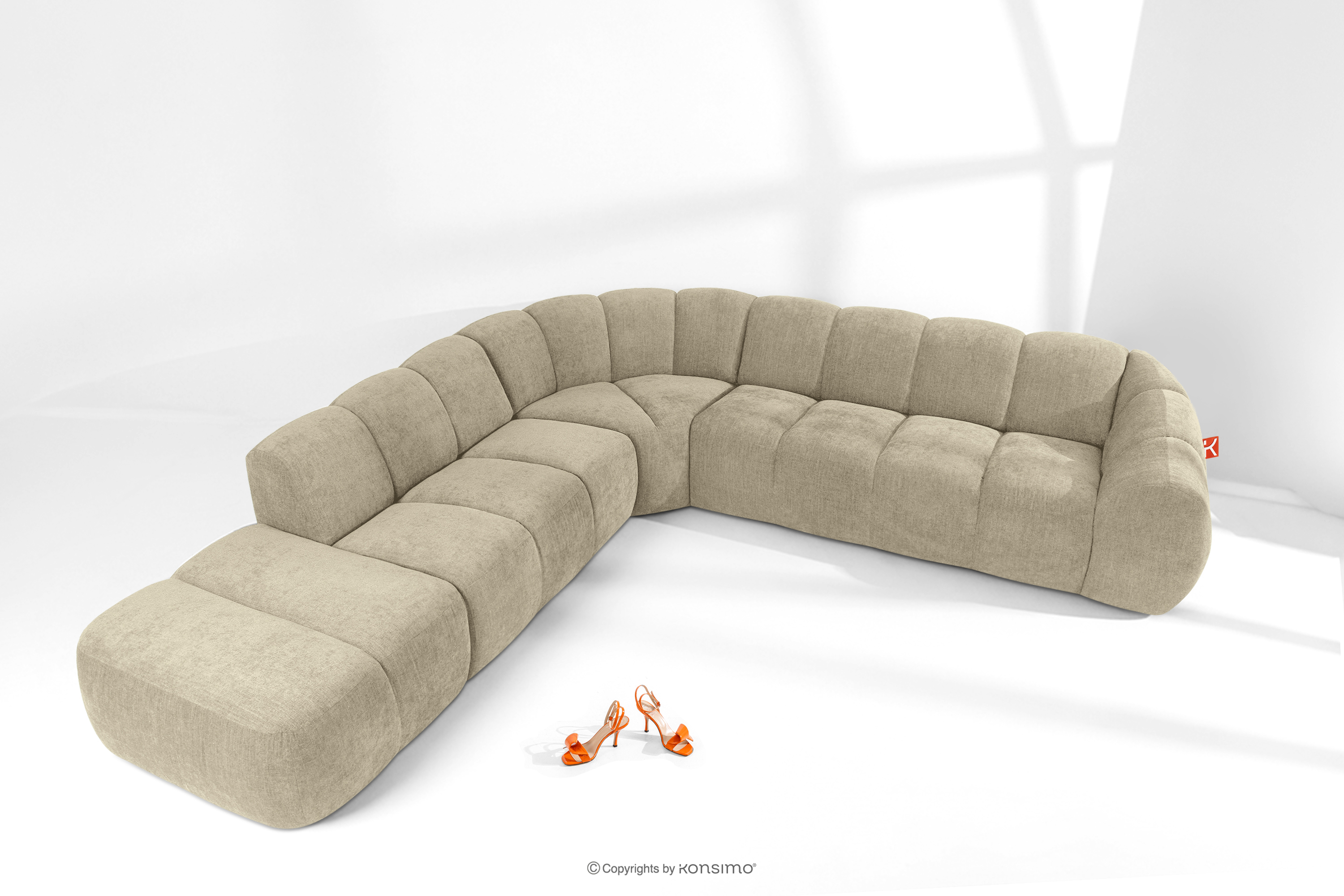 Duży pikowany narożnik modułowy w stylu retro modern lewy piaskowy stanowi kwintesencję nowoczesnego spojrzenia na stylistykę retro-modern, w której obłe, organiczne formy spotykają się z bezkompromisową funkcjonalnością współczesnego projektowania modułowego. Każdy element tej serii został zaprojektowany z myślą o stworzeniu harmonijnej przestrzeni, która celebruje miękkie linie i geometryczny rytm charakterystyczny dla ikon designu lat siedemdziesiątych, ale w odświeżonym, luksusowym wydaniu.