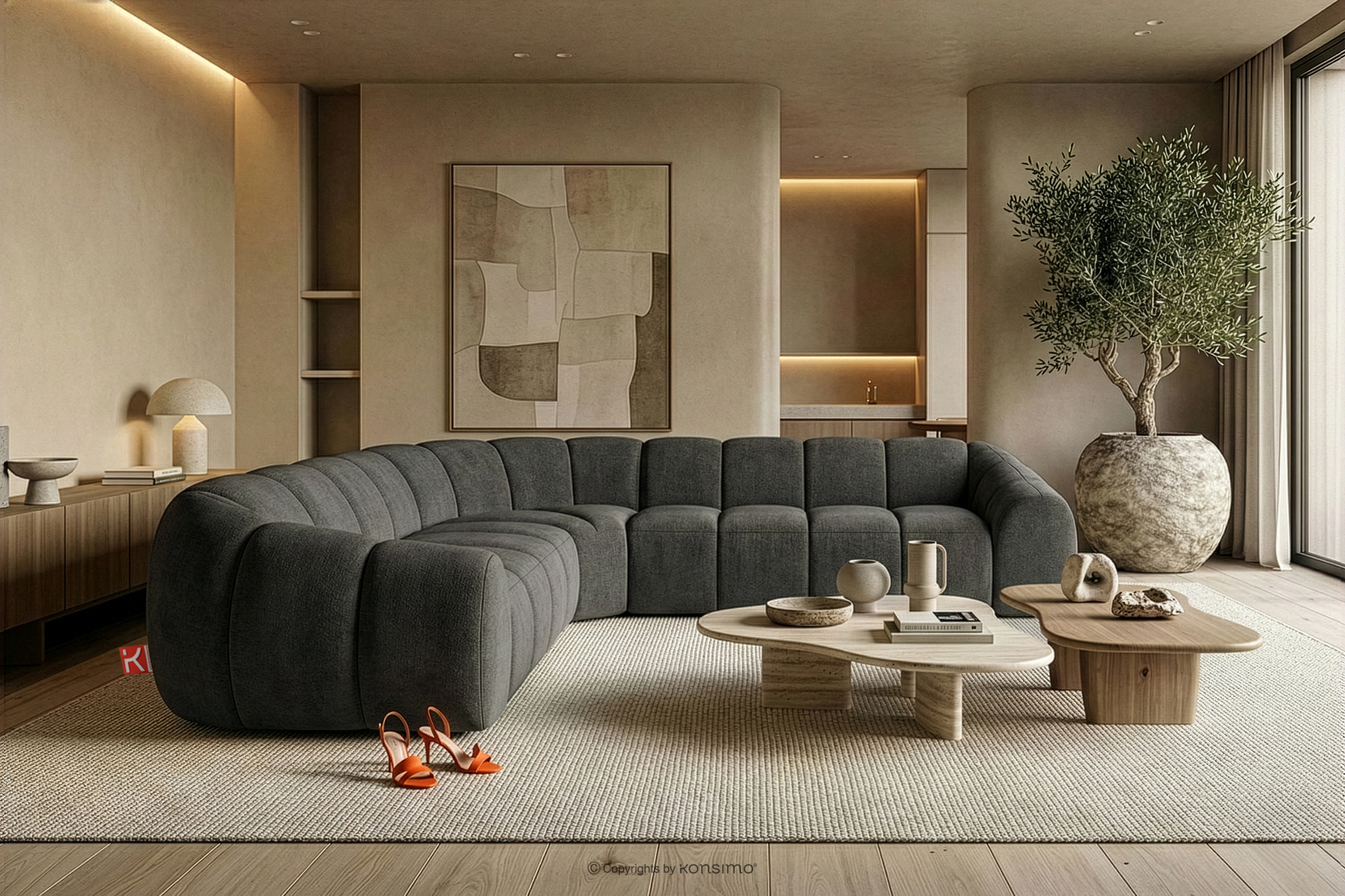 Modułowy narożnik w stylu modern retro prawy/lewy grafitowy stanowi kwintesencję nowoczesnego spojrzenia na stylistykę retro-modern, w której obłe, organiczne formy spotykają się z bezkompromisową funkcjonalnością współczesnego projektowania modułowego. Każdy element tej serii został zaprojektowany z myślą o stworzeniu harmonijnej przestrzeni, która celebruje miękkie linie i geometryczny rytm charakterystyczny dla ikon designu lat siedemdziesiątych, ale w odświeżonym, luksusowym wydaniu.