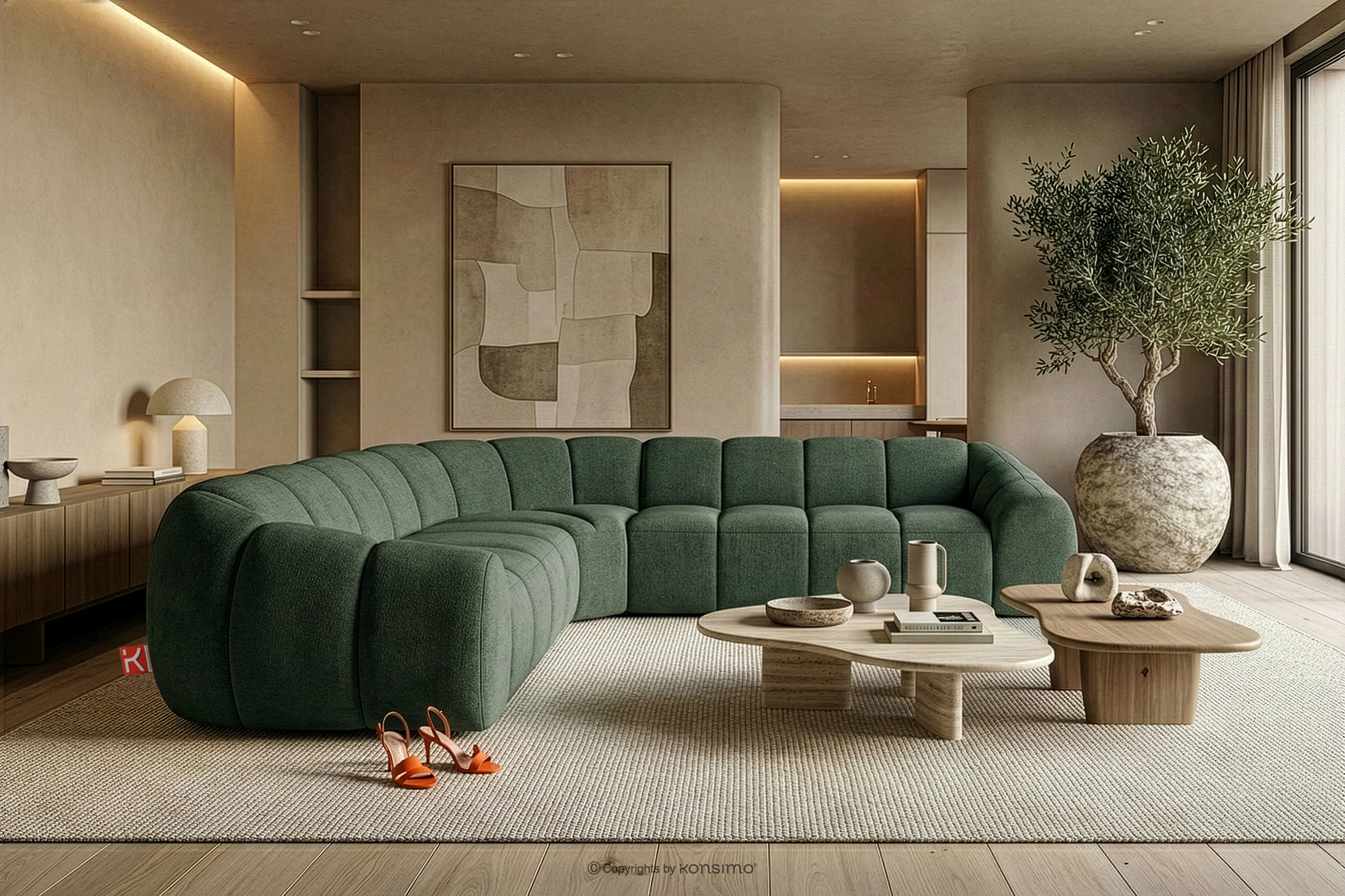 Modułowy narożnik w stylu modern retro prawy/lewy ciemny zielony stanowi kwintesencję nowoczesnego spojrzenia na stylistykę retro-modern, w której obłe, organiczne formy spotykają się z bezkompromisową funkcjonalnością współczesnego projektowania modułowego. Każdy element tej serii został zaprojektowany z myślą o stworzeniu harmonijnej przestrzeni, która celebruje miękkie linie i geometryczny rytm charakterystyczny dla ikon designu lat siedemdziesiątych, ale w odświeżonym, luksusowym wydaniu.