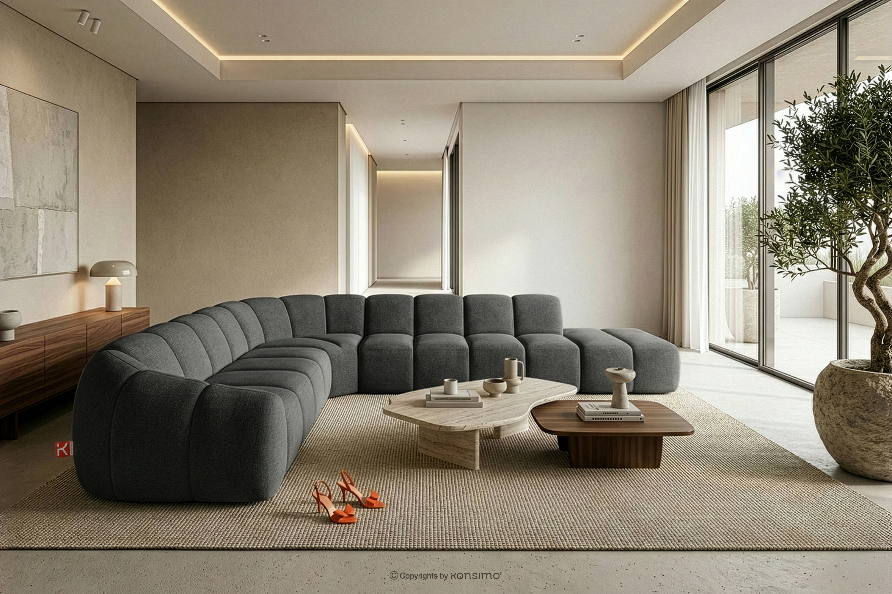 Modułowy narożnik curve w stylu retro modern prawy grafitowy stanowi kwintesencję nowoczesnego spojrzenia na stylistykę retro-modern, w której obłe, organiczne formy spotykają się z bezkompromisową funkcjonalnością współczesnego projektowania modułowego. Każdy element tej serii został zaprojektowany z myślą o stworzeniu harmonijnej przestrzeni, która celebruje miękkie linie i geometryczny rytm charakterystyczny dla ikon designu lat siedemdziesiątych, ale w odświeżonym, luksusowym wydaniu.