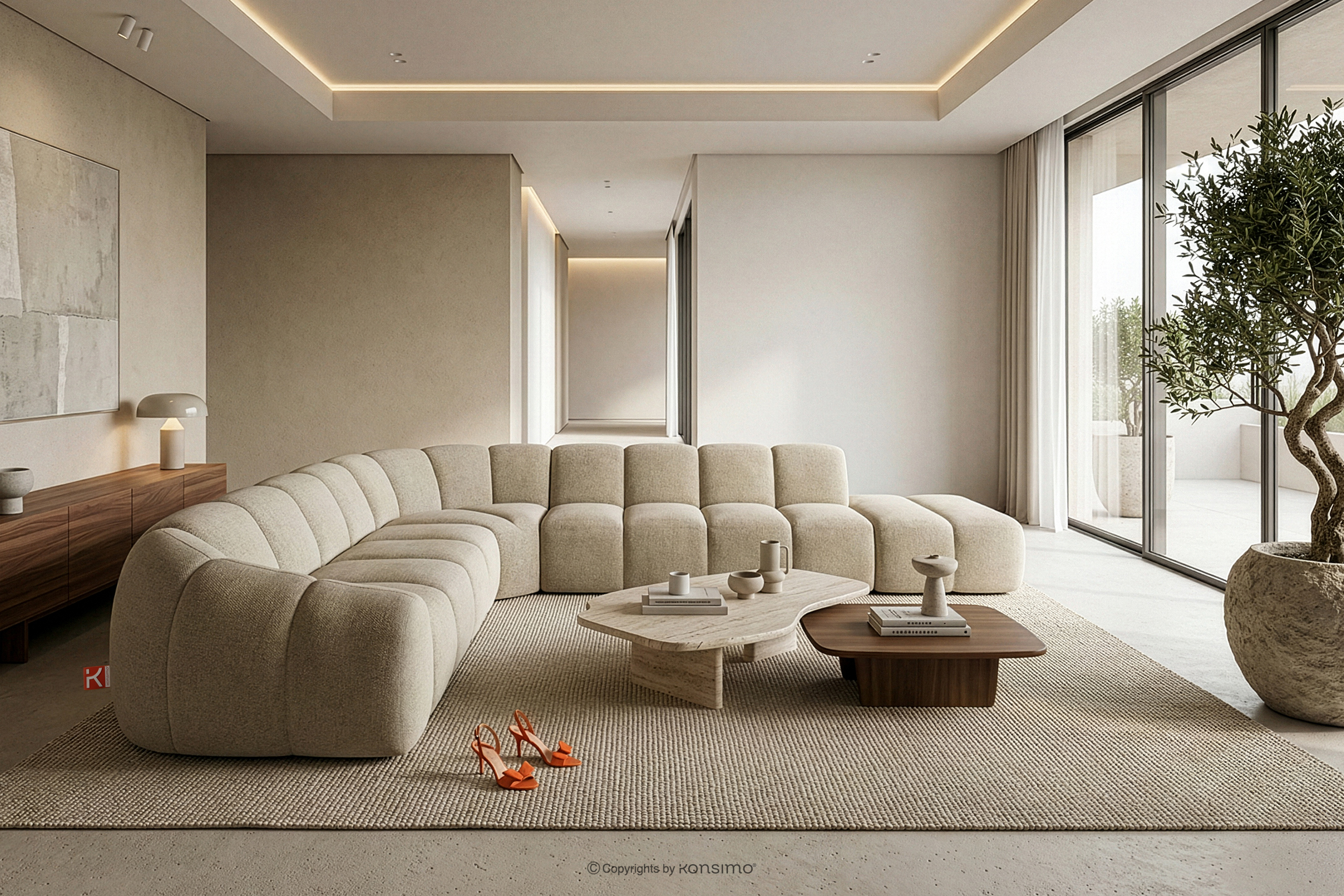 Modułowy narożnik curve w stylu retro modern prawy piaskowy stanowi kwintesencję nowoczesnego spojrzenia na stylistykę retro-modern, w której obłe, organiczne formy spotykają się z bezkompromisową funkcjonalnością współczesnego projektowania modułowego. Każdy element tej serii został zaprojektowany z myślą o stworzeniu harmonijnej przestrzeni, która celebruje miękkie linie i geometryczny rytm charakterystyczny dla ikon designu lat siedemdziesiątych, ale w odświeżonym, luksusowym wydaniu.