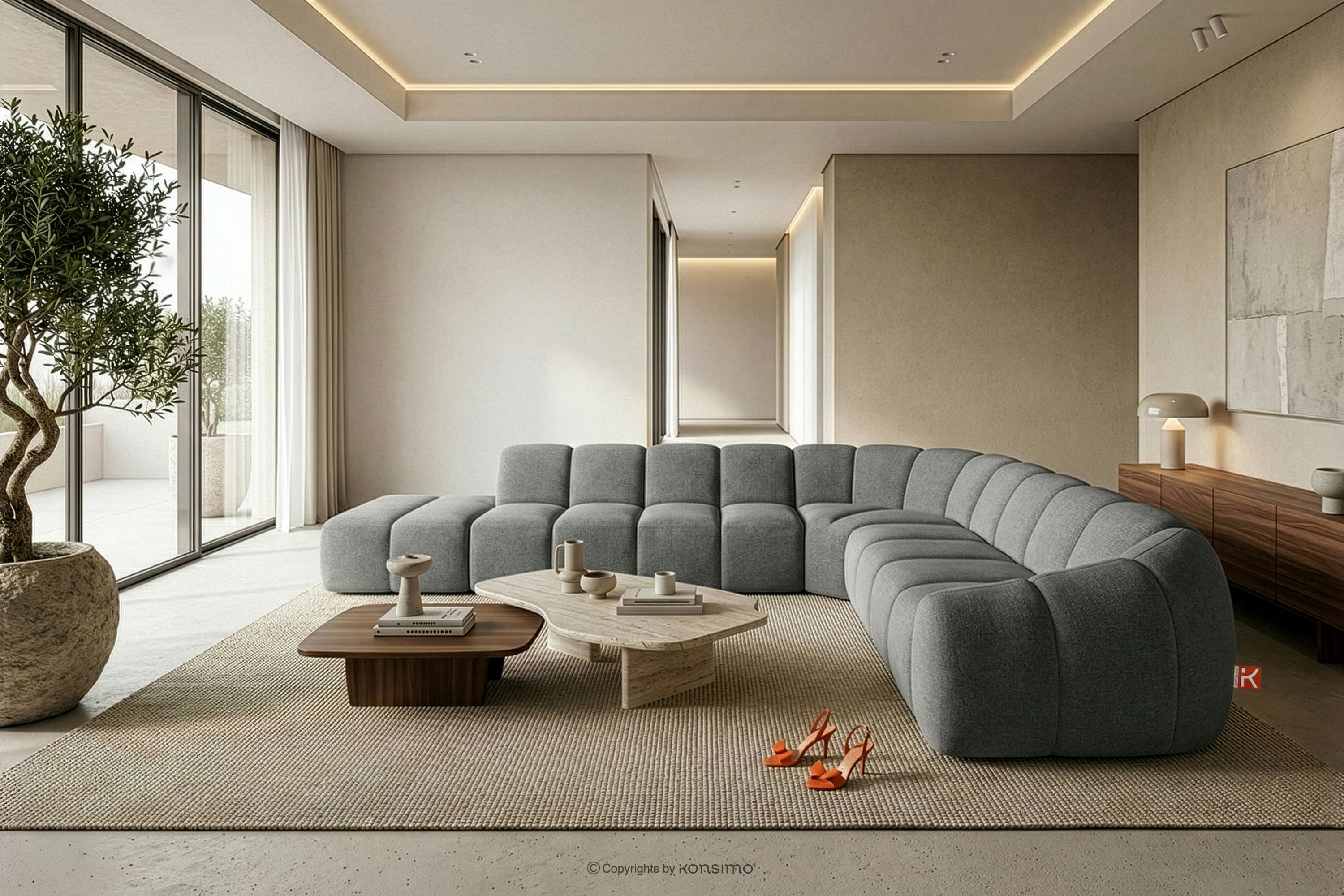 Modułowy narożnik curve w stylu retro modern lewy popielaty stanowi kwintesencję nowoczesnego spojrzenia na stylistykę retro-modern, w której obłe, organiczne formy spotykają się z bezkompromisową funkcjonalnością współczesnego projektowania modułowego. Każdy element tej serii został zaprojektowany z myślą o stworzeniu harmonijnej przestrzeni, która celebruje miękkie linie i geometryczny rytm charakterystyczny dla ikon designu lat siedemdziesiątych, ale w odświeżonym, luksusowym wydaniu.