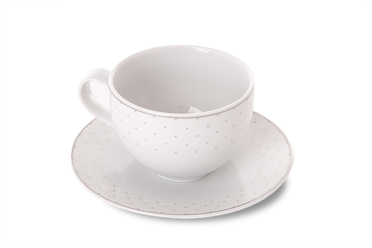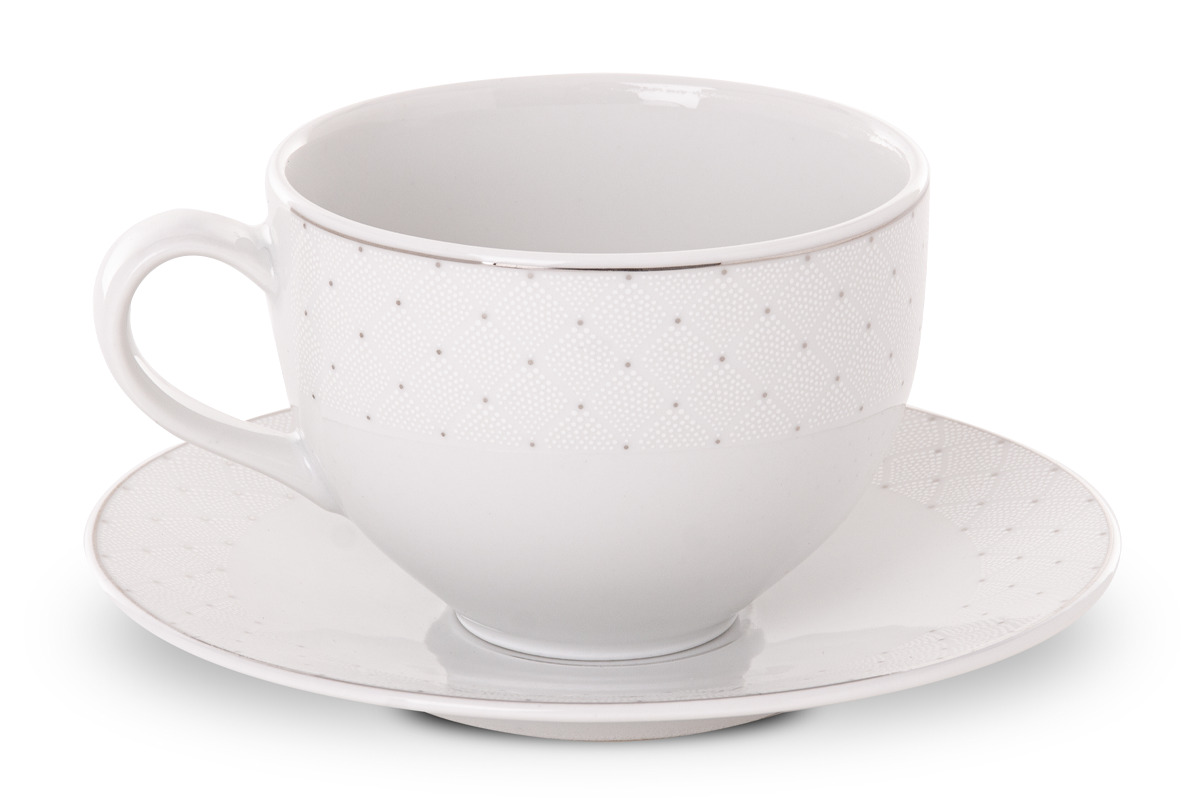 Nieprzeciętna kolekcja naczyń AMELIA CARMEN wyróżnia się zdobieniami w postaci połyskujących i połączonych ze sobą kropek – całość tworzy wyszukany wzór, pełen lekkości i elegancji. Ponadto srebrne wykończenia na brzegach podkreślają piękną biel porcelany. Kolekcję wykonano w całości w polskich fabrykach z najwyższej jakości porcelany, dzięki czemu przez długie lata będzie przyozdabiać stół czy wypełniać urokiem przeszklone witrynki.