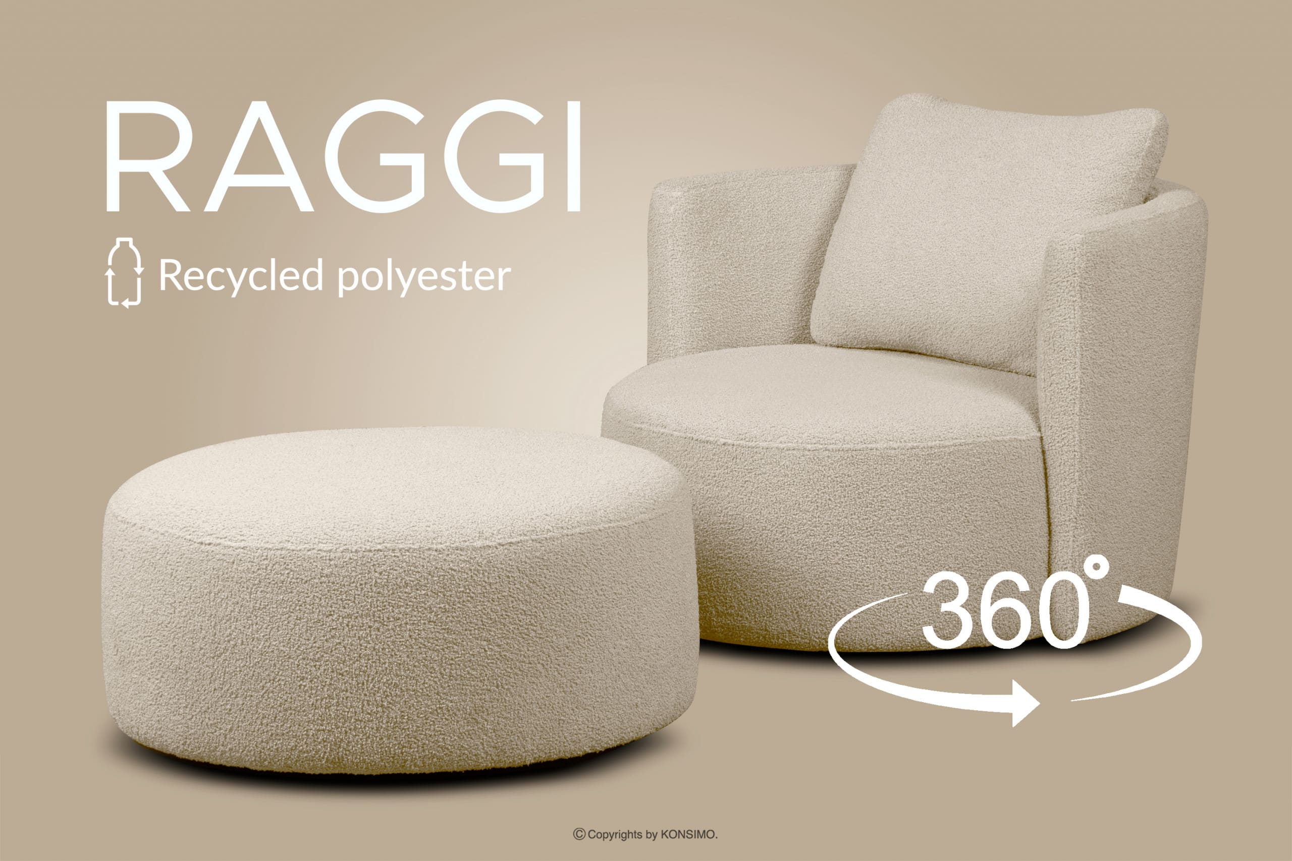 Obicie fotela to tak zwany baranek, który jest bardzo przyjemny w dotyku. Dodatkowym atrybutem tego mebla jest noga obrotowa, dzięki czemu fotel obraca się 360 stopni. Forma pufy RAGGI przyciąga uwagę i podnosi atrakcyjność wnętrza.