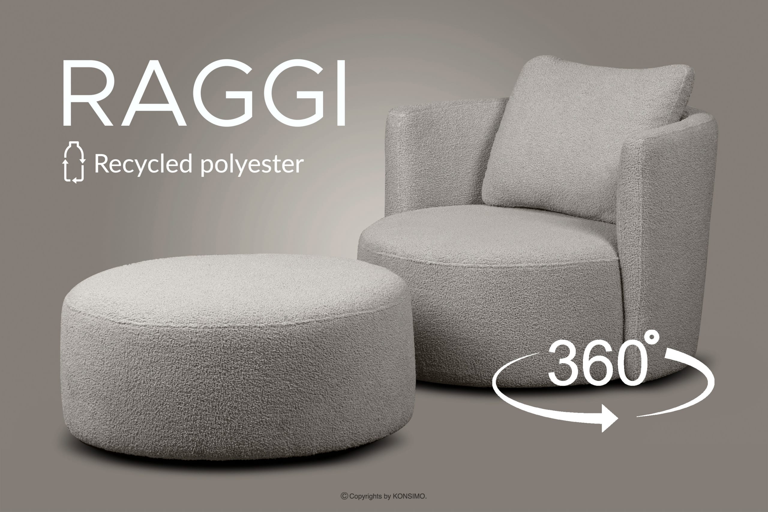Obicie fotela to tak zwany baranek, który jest bardzo przyjemny w dotyku. Dodatkowym atrybutem tego mebla jest noga obrotowa, dzięki czemu fotel obraca się 360 stopni. Forma pufy RAGGI przyciąga uwagę i podnosi atrakcyjność wnętrza.