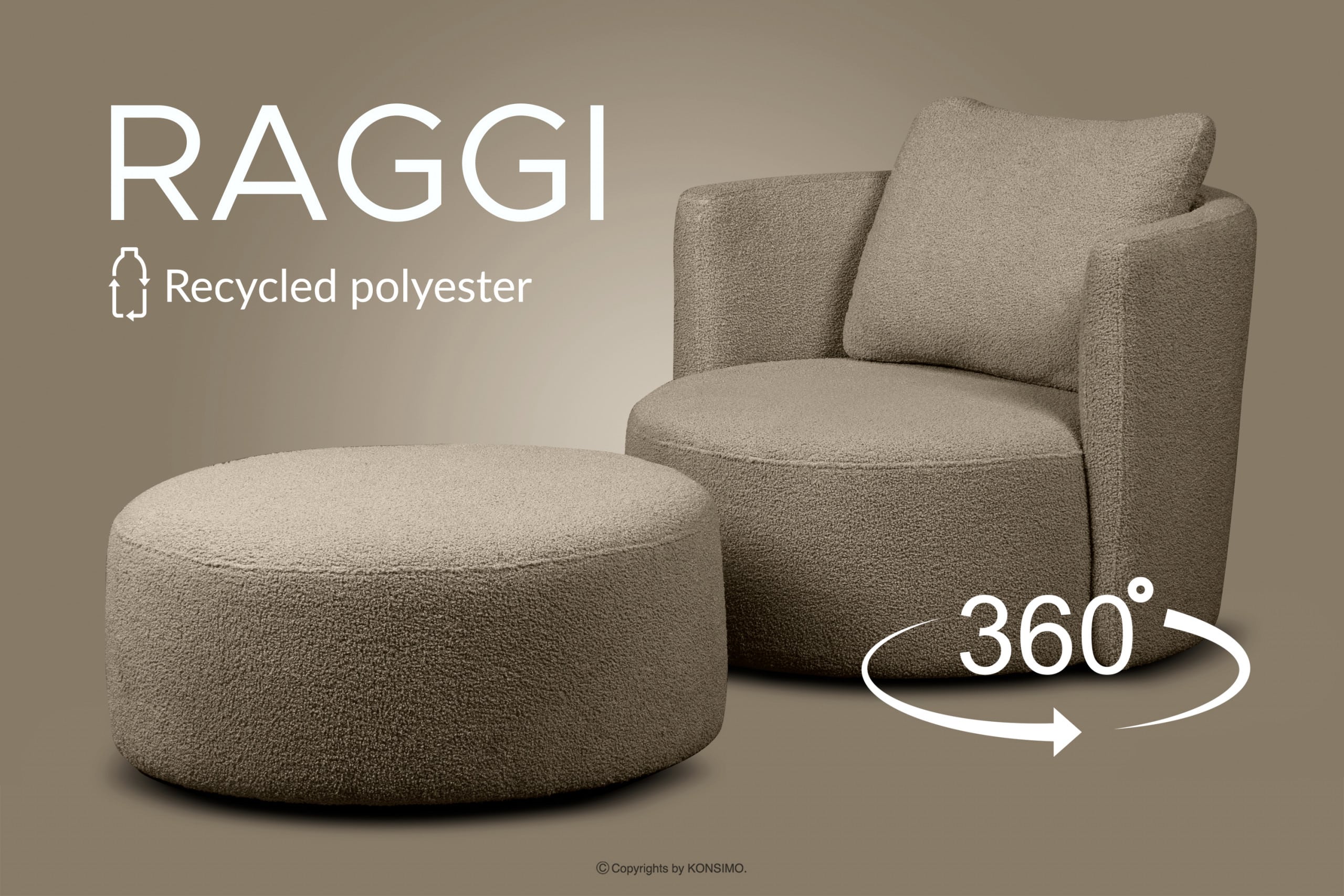 Obicie fotela to tak zwany baranek, który jest bardzo przyjemny w dotyku. Dodatkowym atrybutem tego mebla jest noga obrotowa, dzięki czemu fotel obraca się 360 stopni. Forma pufy RAGGI przyciąga uwagę i podnosi atrakcyjność wnętrza.