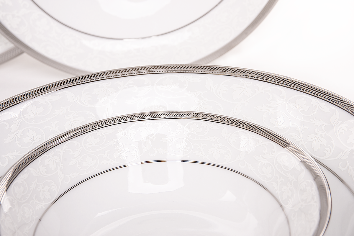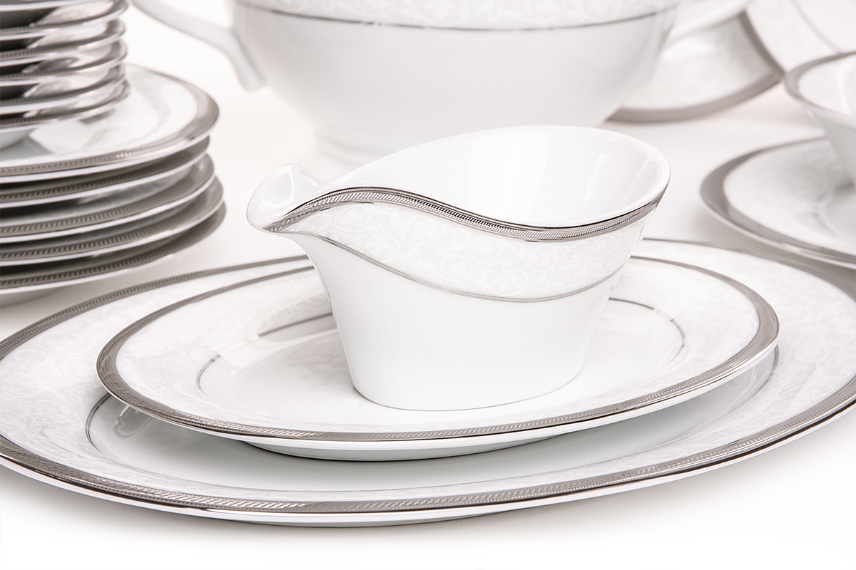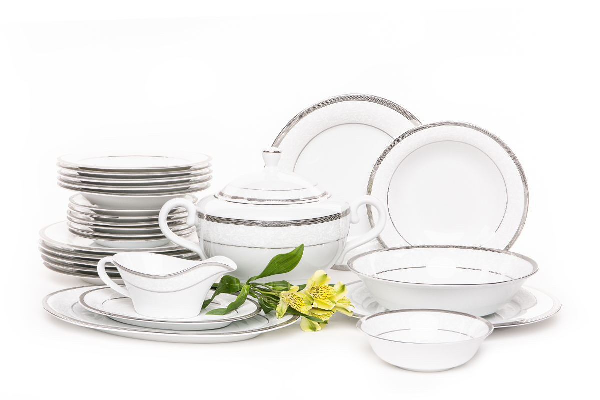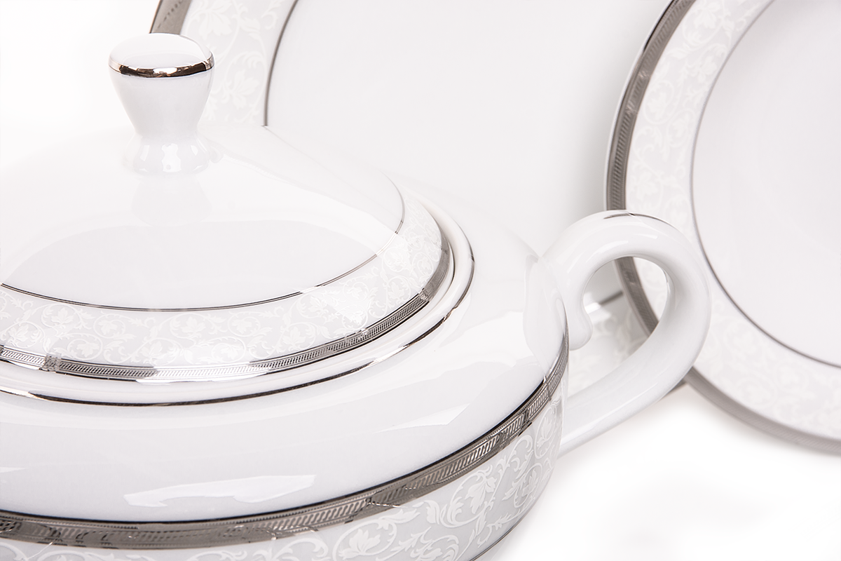dla produktu Serwis obiadowy polska porcelana, sosjerka, waza 25 elementów biały / platynowy wzór dla 6 os.