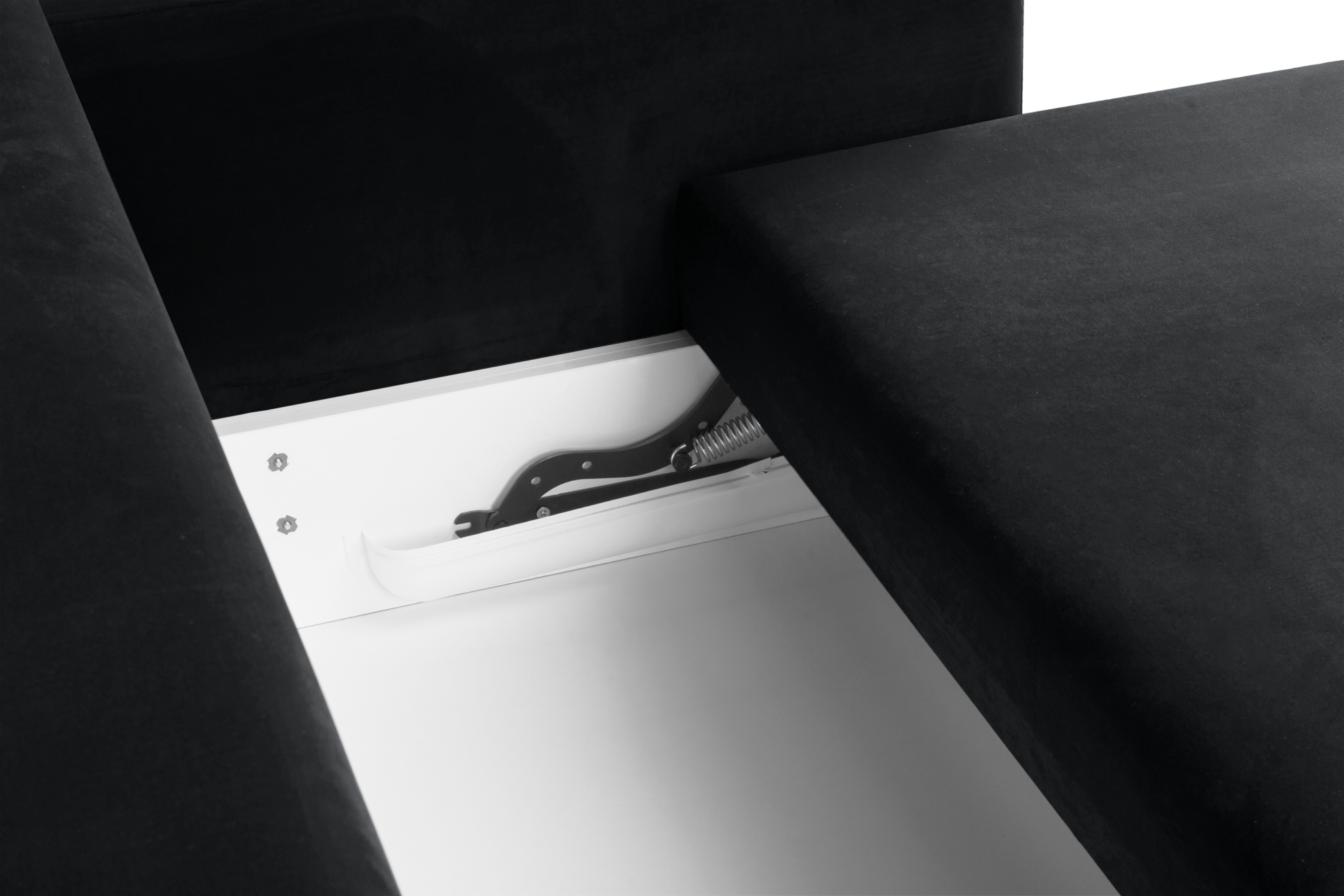 - Stelaż: płyta pilśniowa 3,2mm, wnętrze płyta wiórowa 16mm biała, zewnętrzna część skrzyni otapicerowana tkaniną techniczną