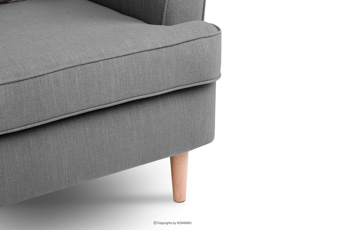 Skandynawski fotel obity tkaniną plecioną w szarym kolorze, ozdabia poduszka dekoracyjna z wyróżniającym go wzorem. Mebel podkreślają drewniane nóżki, o różnych wysokościach - z przodu 14 cm, a z tyłu 16 cm. W siedzisku zastosowano piankę wysokoelastyczna HR 3042 wraz ze sprężyną falistą, których połączenie gwarantuje, że siedzisko się nie zapada i wytrzyma wiele lat. Co najważniejsze, skandynawski fotel STRALIS znakomicie prezentuje się w pojedynkę lub w towarzystwie pufy oraz sofy z tej kolekcji.